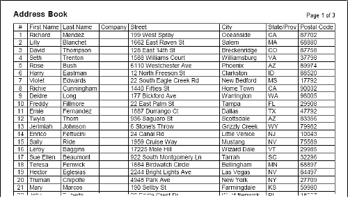 Simple Reports are printed in a tabular list which is similar in appearance to the on-screen grid created with the dbpShowgrid action. The report is created automatically using the color and font settings applied to the current table grid. Custom headers and footers may be added using the dbpListAddHeader and dbpListAddFooter actions. Simple reports are very easy to create, but control over the appearance, formatting and placement of data is limited. Below is an example of a typical simple report: